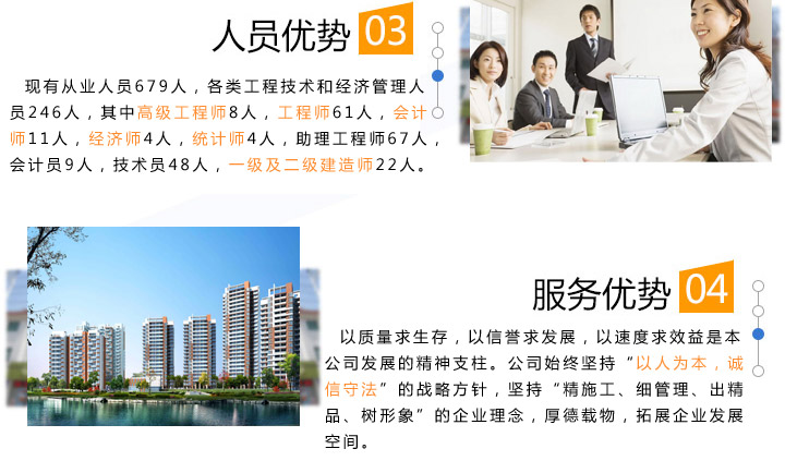 質(zhì)量求生存,以信譽(yù)求發(fā)展,以速度求效益是本公司發(fā)展的精神支柱。公司始終堅(jiān)持“以人為本,誠信守法”的戰(zhàn)略方針,堅(jiān)持“精施工、細(xì)管理、出精品、樹形象”的企業(yè)理念,厚德載物,拓展企業(yè)發(fā)展空間。